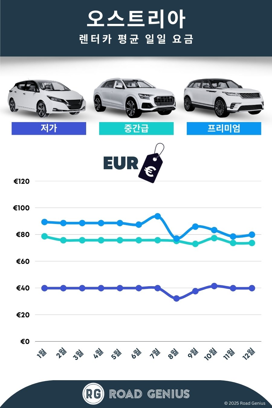 평균적으로 오스트리아에서 렌터카 요금은 하루에 약 €67이며, 최저가는 하루에 €32부터 이용할 수 있습니다.