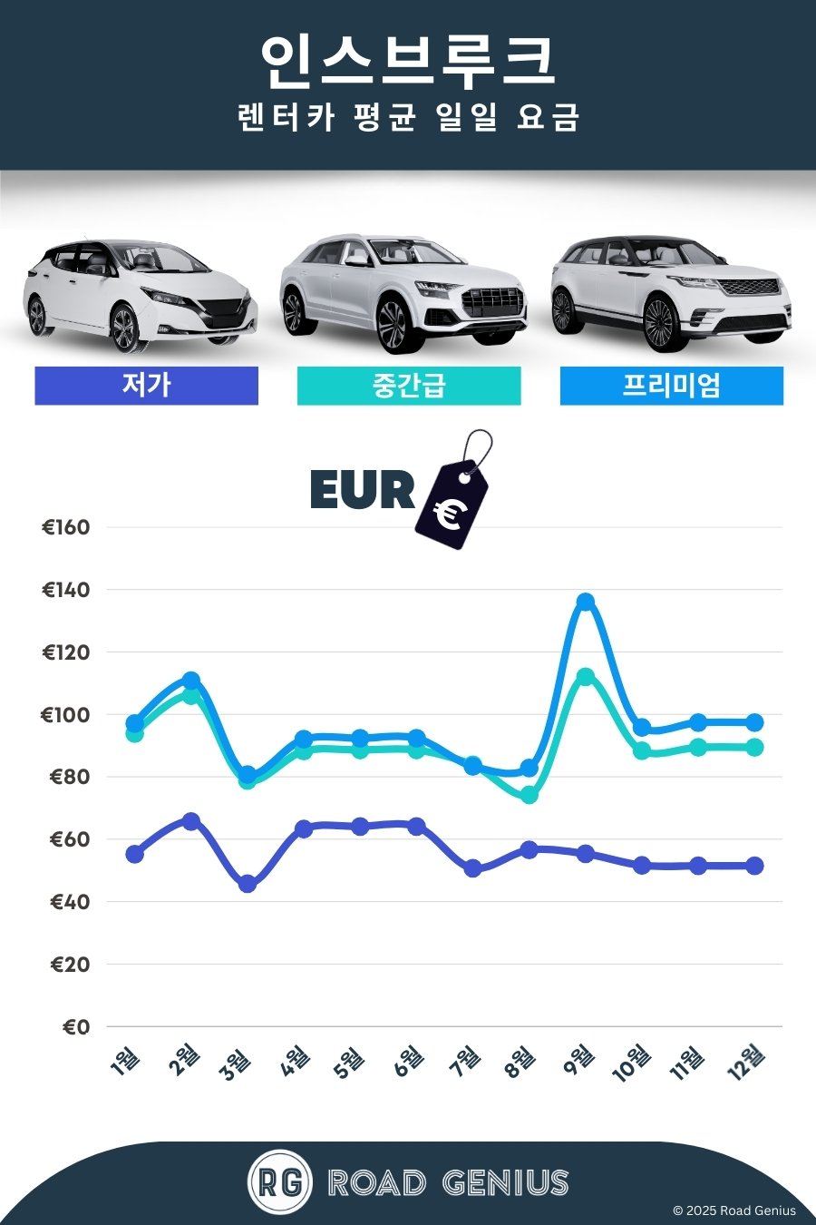 평균적으로 인스브루크에서 렌터카 요금은 하루에 약 €81이며, 최저가는 하루에 €46부터 이용할 수 있습니다.