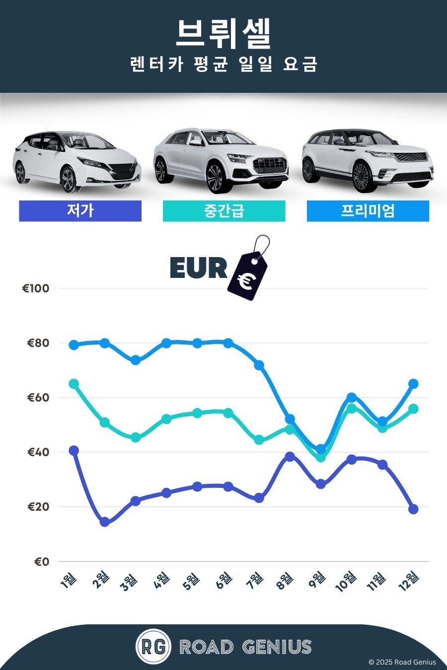 평균적으로 브뤼셀에서 렌터카 요금은 하루에 약 €49이며, 최저가는 하루에 €14부터 이용할 수 있습니다.