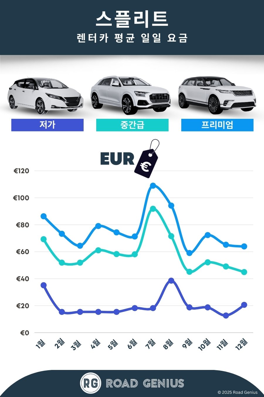 평균적으로 스플리트에서 렌터카 요금은 하루에 약 €52이며, 최저가는 하루에 €13부터 이용할 수 있습니다.