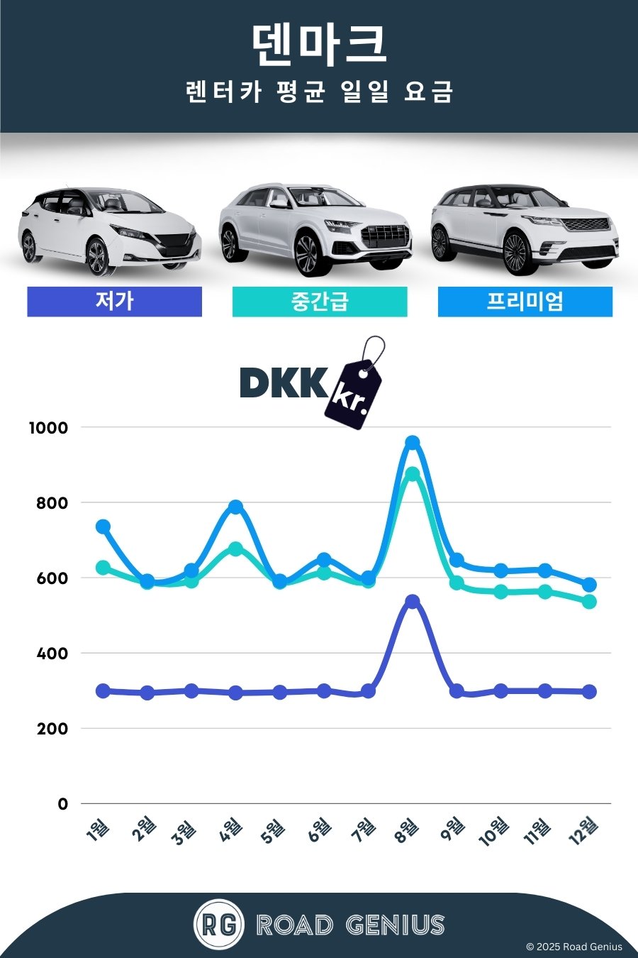 평균적으로 덴마크에서 렌터카 요금은 하루에 약 kr 533이며, 최저가는 하루에 kr 294부터 이용할 수 있습니다.