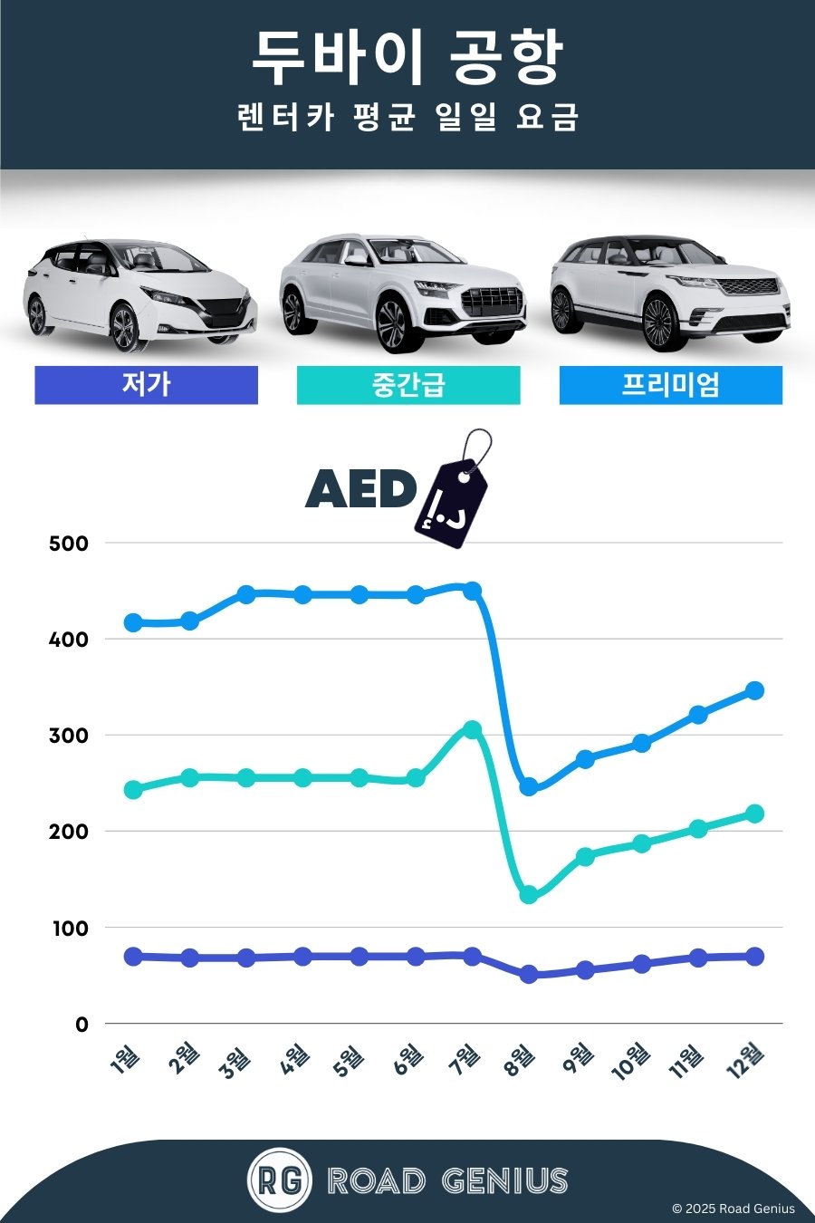 평균적으로 두바이공항에서 렌터카 요금은 하루에 약 AED 224이며, 최저가는 하루에 AED 51부터 이용할 수 있습니다.