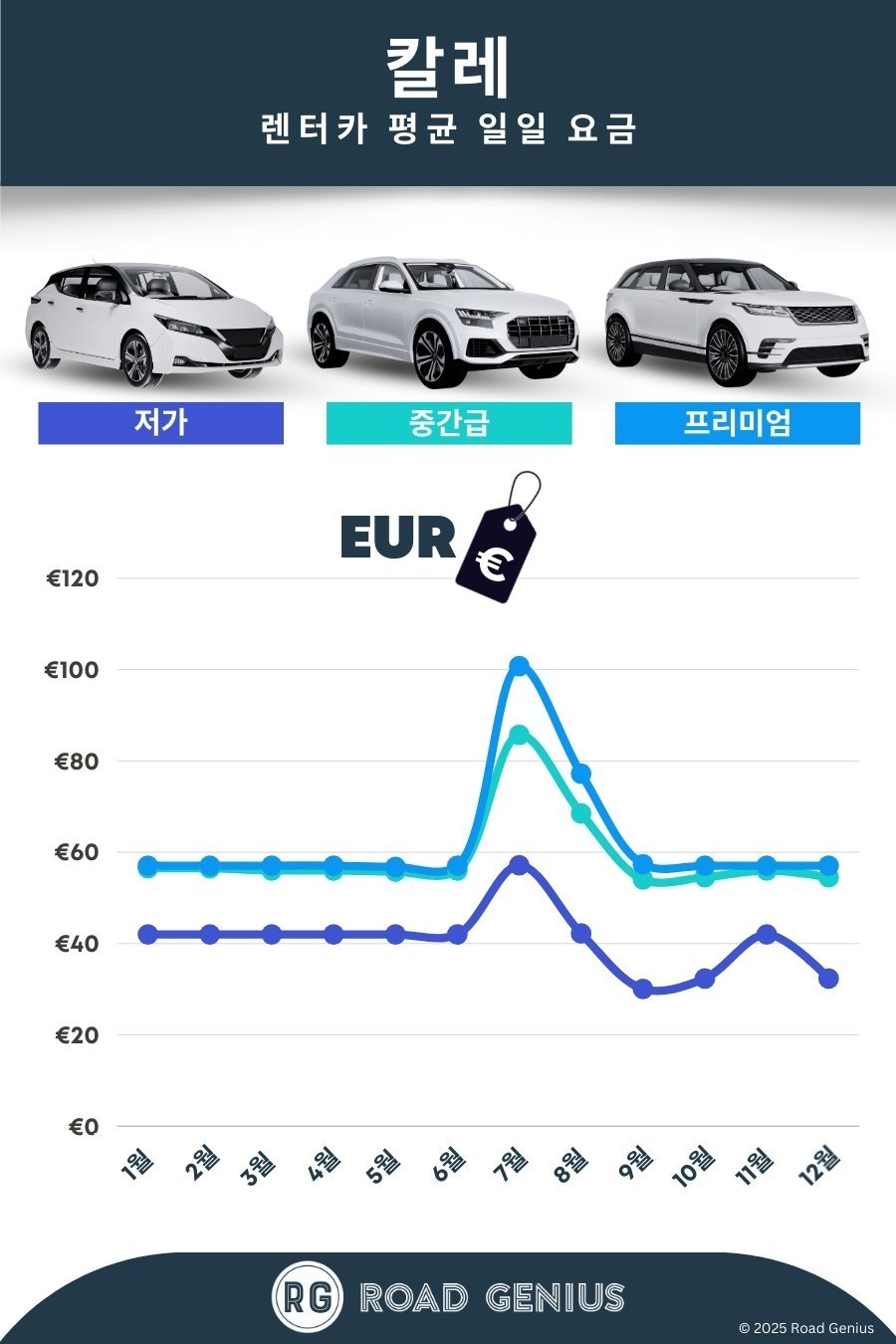 평균적으로 칼레에서 렌터카 요금은 하루에 약 €54이며, 최저가는 하루에 €30부터 이용할 수 있습니다.