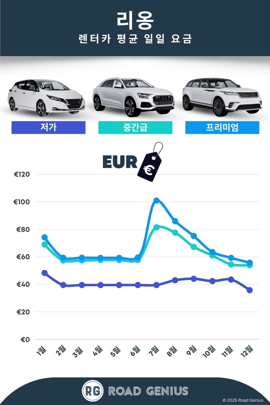 평균적으로 리옹에서 렌터카 요금은 하루에 약 €57이며, 최저가는 하루에 €36부터 이용할 수 있습니다.