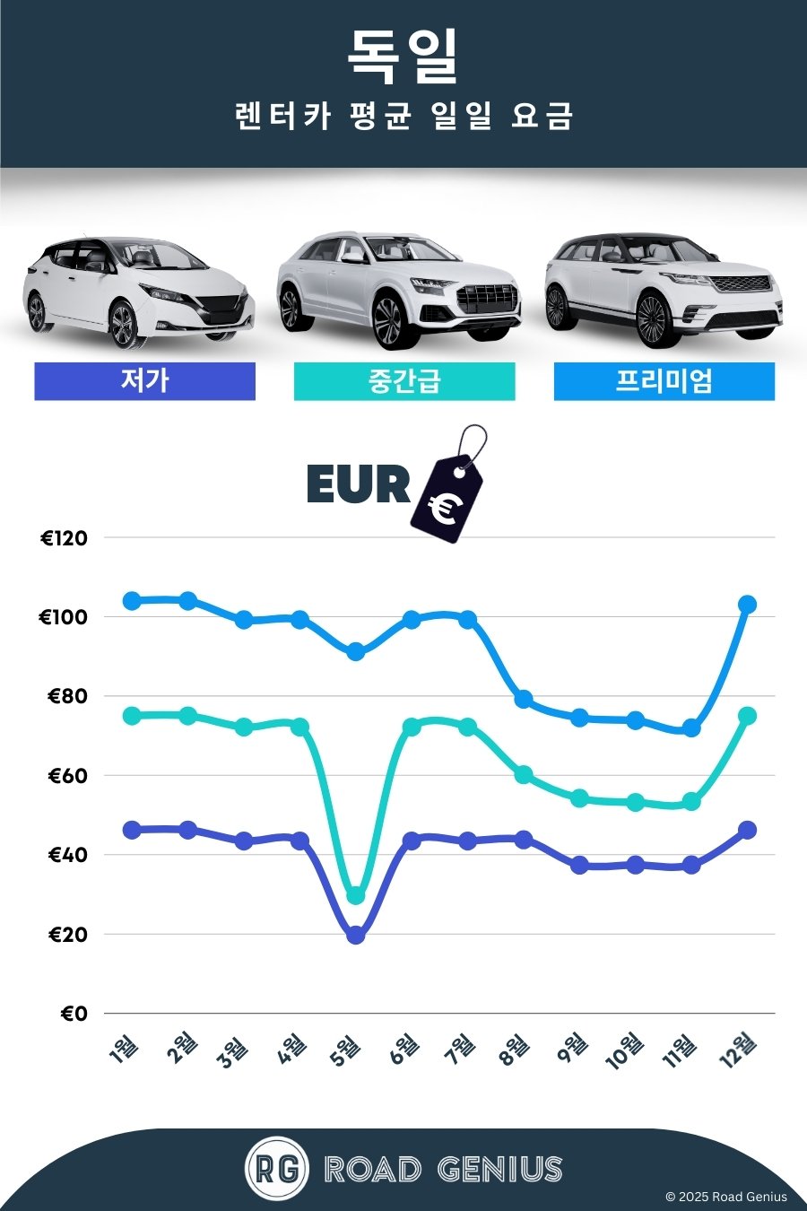 평균적으로 독일에서 렌터카 요금은 하루에 약 €65이며, 최저가는 하루에 €20부터 이용할 수 있습니다.