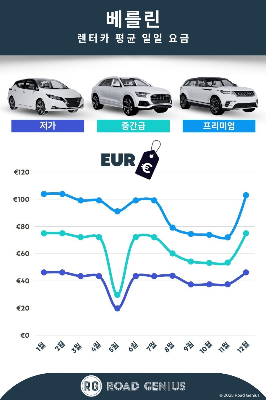 평균적으로 베를린에서 렌터카 요금은 하루에 약 €65이며, 최저가는 하루에 €20부터 이용할 수 있습니다.