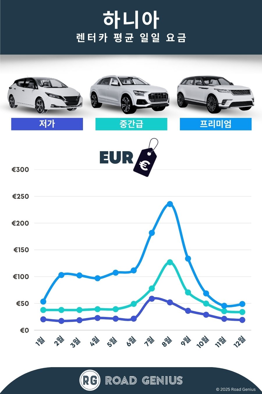 픽업 장소를 비교하세요. 공항은 편리하지만 추가 요금이 발생할 수 있습니다. 셔틀버스를 운행하는 공항 외부 지점이 보통 더 저렴합니다. 여행 첫날 차량이 필요 없다면 하니아 시내에서 빌리는 것이 가장 경제적일 수 있습니다.