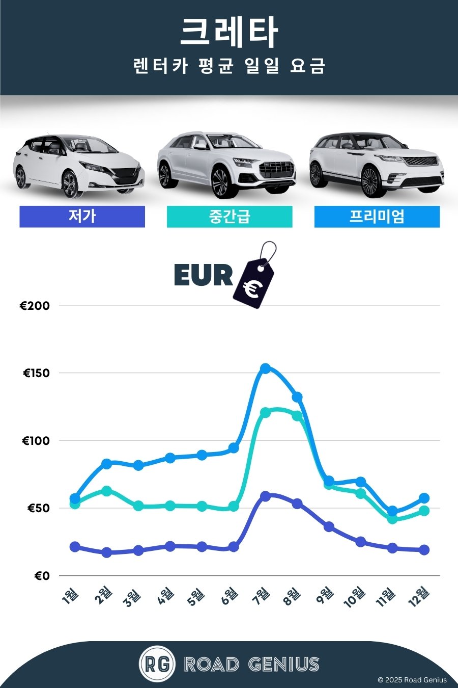 평균적으로 크레타에서 렌터카 요금은 하루에 약 €59이며, 최저가는 하루에 €17부터 이용할 수 있습니다.
