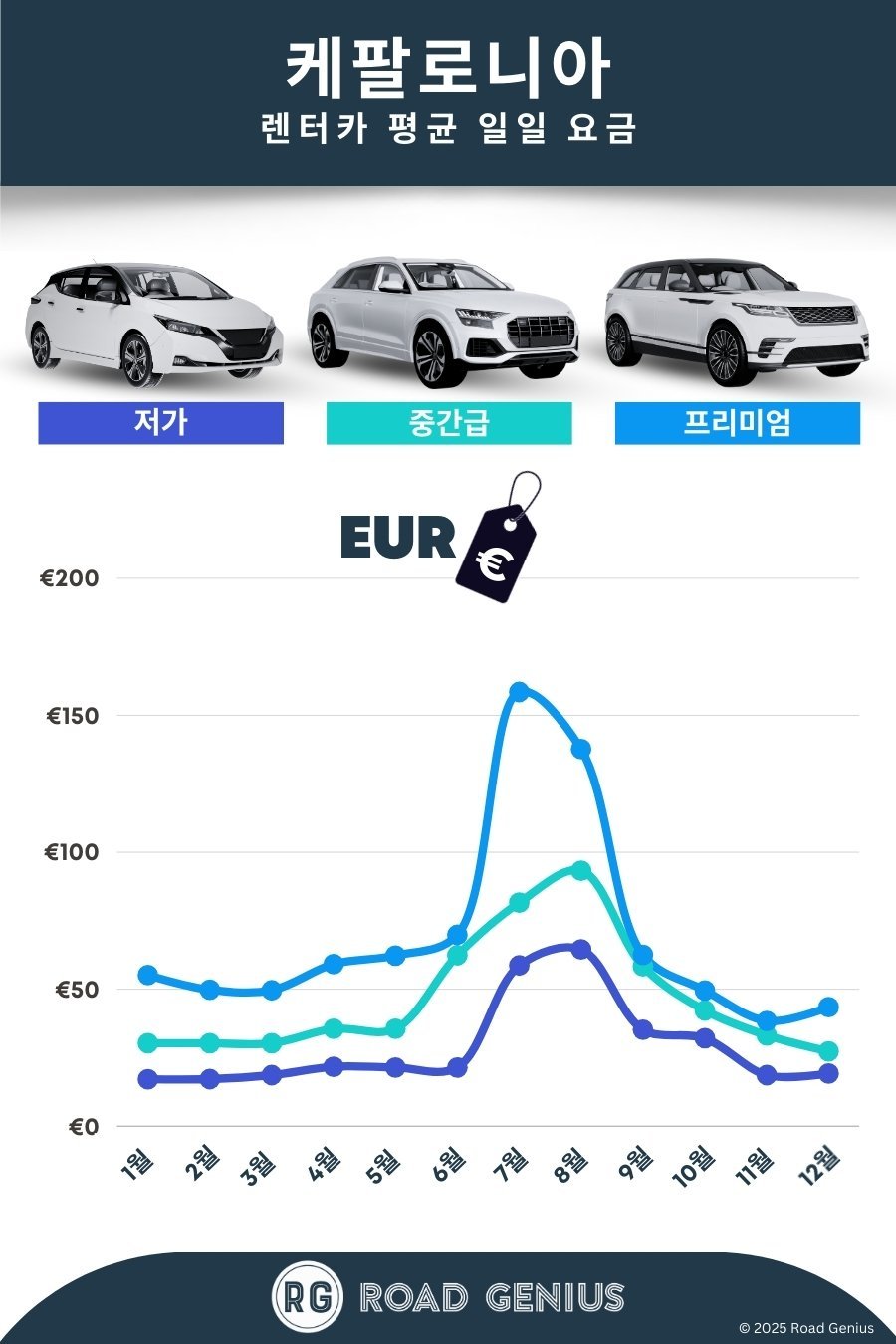 평균적으로 케팔로니아에서 렌터카 요금은 하루에 약 €48이며, 최저가는 하루에 €17부터 이용할 수 있습니다.