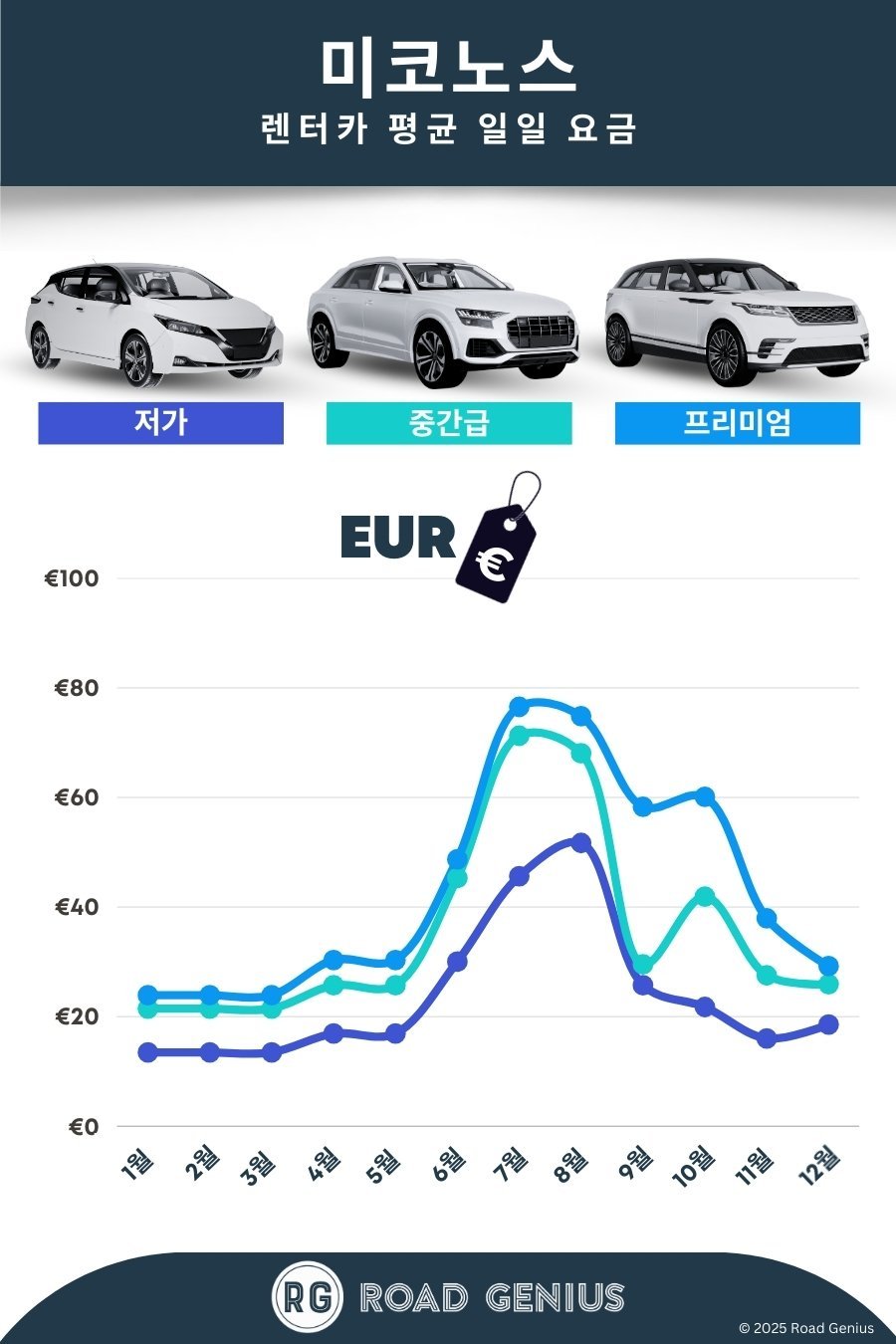 소형 수동차 선택: 소형차는 렌트비와 유류비가 저렴하며, 미코노스의 좁은 주차 공간에 적합합니다. 수동차는 재고가 많고 자동차보다 저렴합니다.