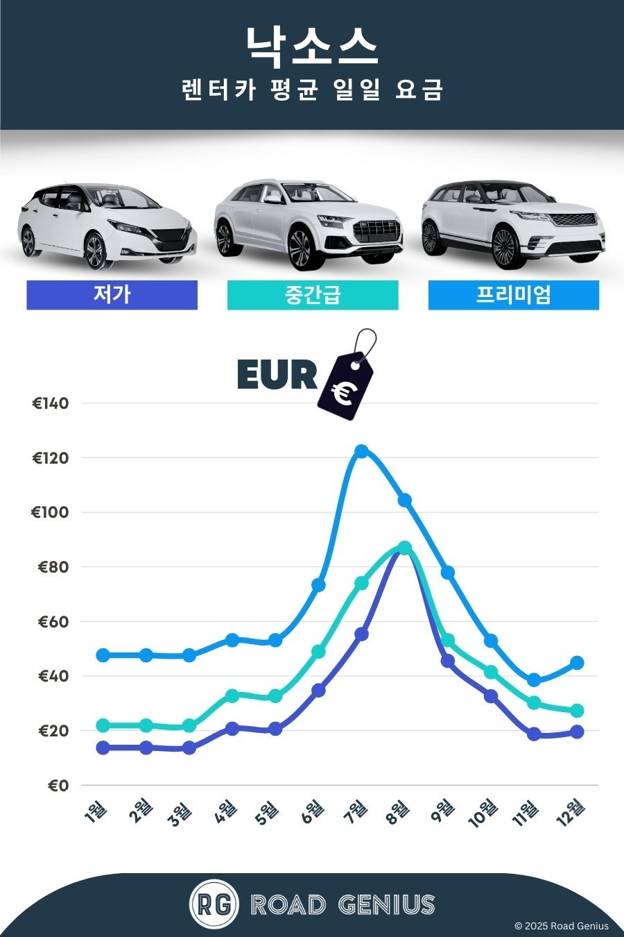 로드 지니어스에서 낙소스의 주요 렌터카 업체 가격을 비교해 보세요. 경제적인 소형차부터 대형 SUV, 미니밴까지 다양한 차종을 편리한 장소에서 합리적인 가격으로 이용하실 수 있습니다. 낙소스 공항(JNX), 낙소스 항구 또는 낙소스 타운(코라)에서 차량을 픽업하여 아름다운 해변과 산악 마을을 자유롭게 여행해 보세요. 7월과 8월은 성수기이므로 예약이 빠르게 마감됩니다. 특히 자동 변속기 차량이나 가족용 대형 차량은 미리 예약하는 것이 좋습니다.