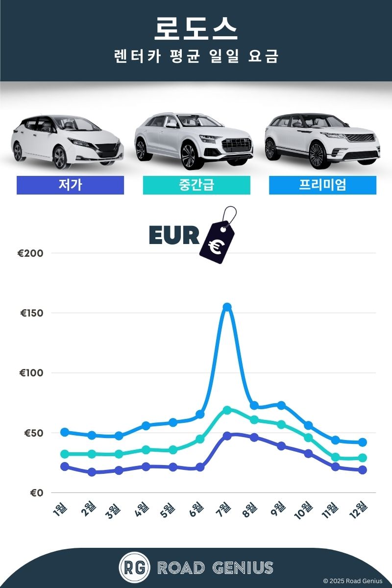 로도스의 모든 곳을 일반 차량으로 여행할 수 있나요? 4x4 차량이 필요한가요? 네, 로도스는 일반 승용차로 여행하기에 충분합니다. 주요 명소와 대부분의 관광지가 포장도로로 잘 연결되어 있어 4x4(사륜구동) 차량은 거의 필요하지 않습니다. 대부분의 렌터카 업체는 4WD 차량이라도 계약상 비포장도로, 해변, 오프로드 주행을 금지하고 있습니다. 보험 적용이 제외될 수 있으므로, 대여 전 계약서의 관련 규정을 반드시 확인해야 합니다.