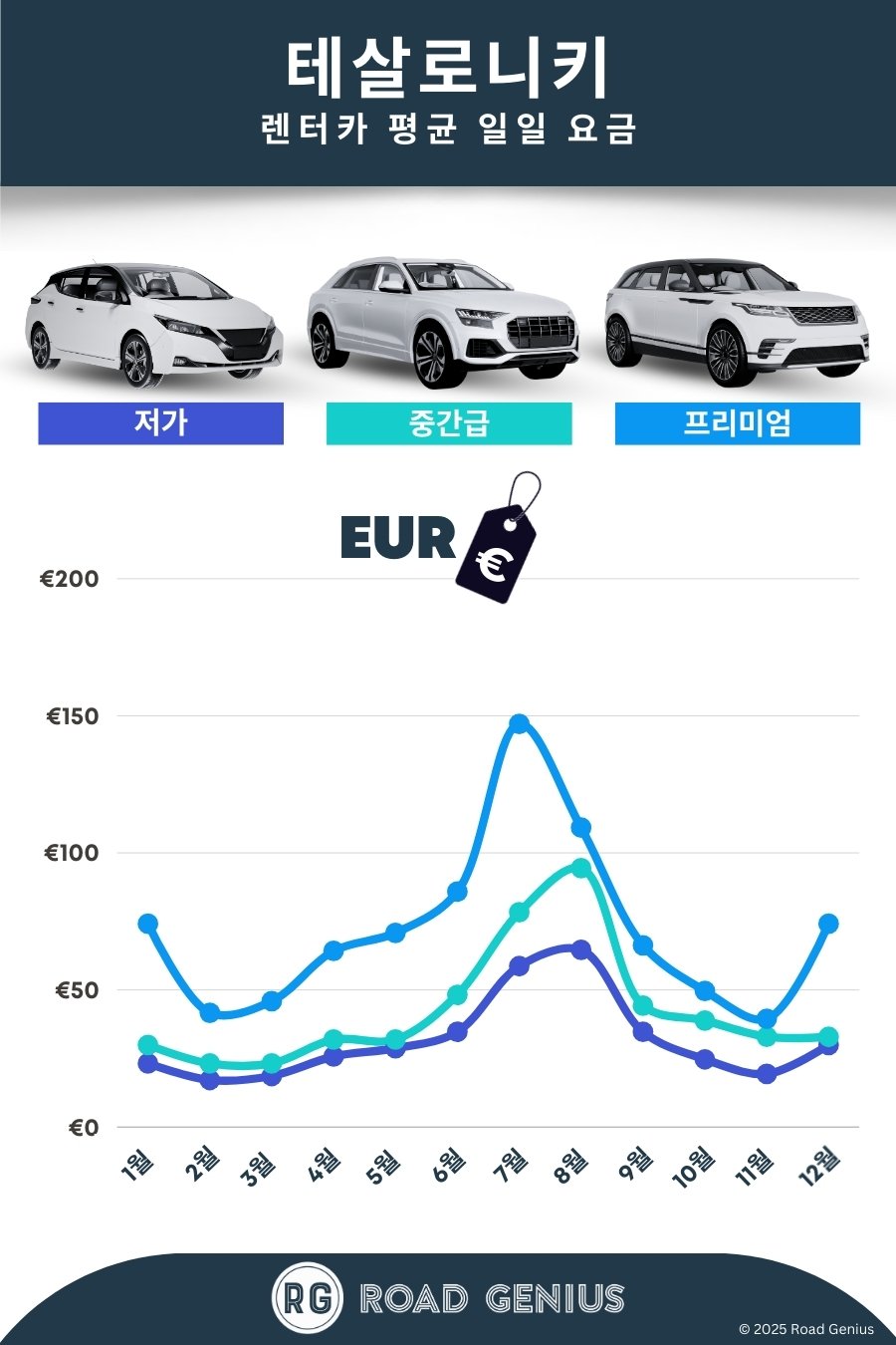 평균적으로 테살로니키에서 렌터카 요금은 하루에 약 €49이며, 최저가는 하루에 €17부터 이용할 수 있습니다.