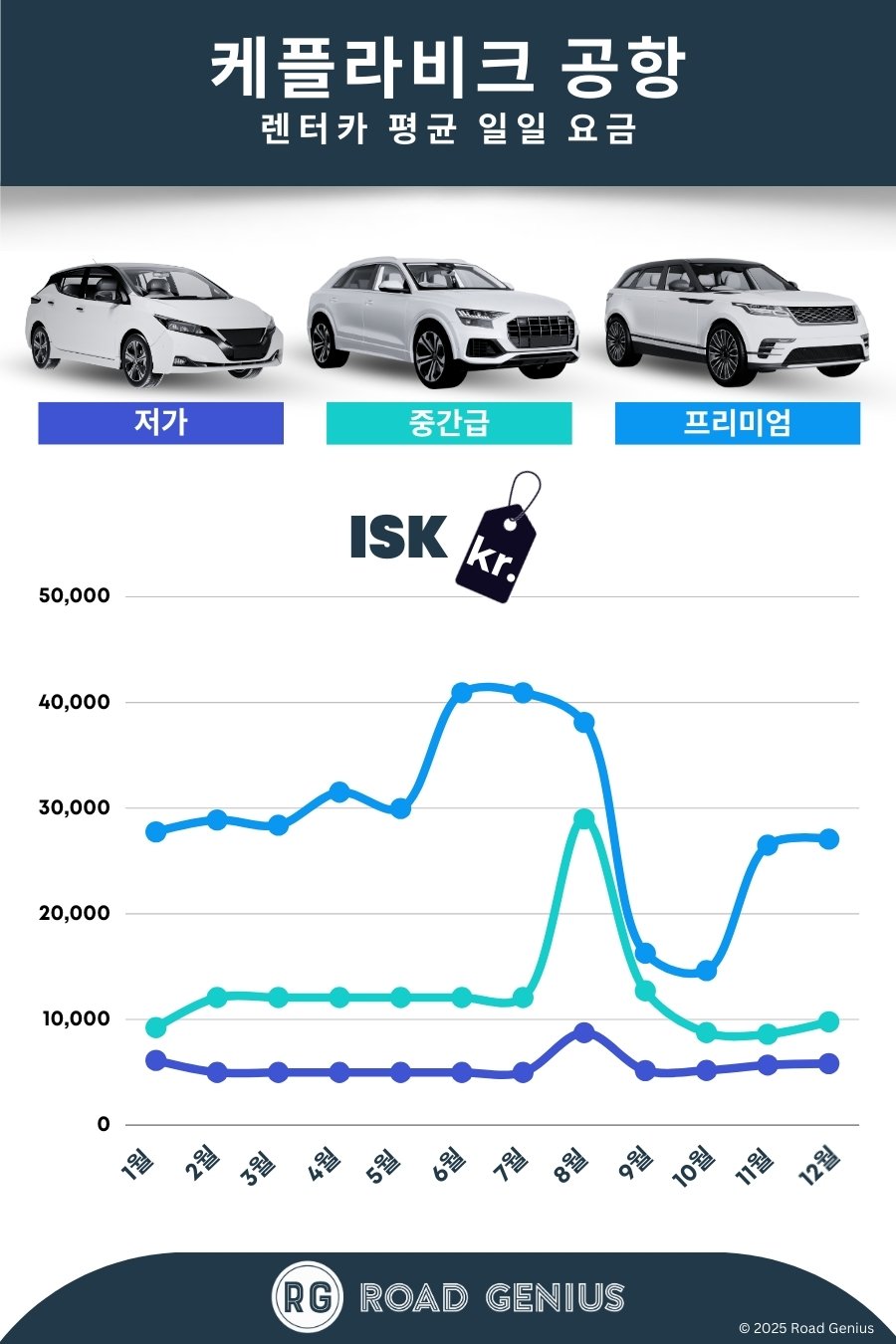 평균적으로 케플라비크 공항에서 렌터카 요금은 하루에 약 ISK 15,750이며, 최저가는 하루에 ISK 4,973부터 이용할 수 있습니다.