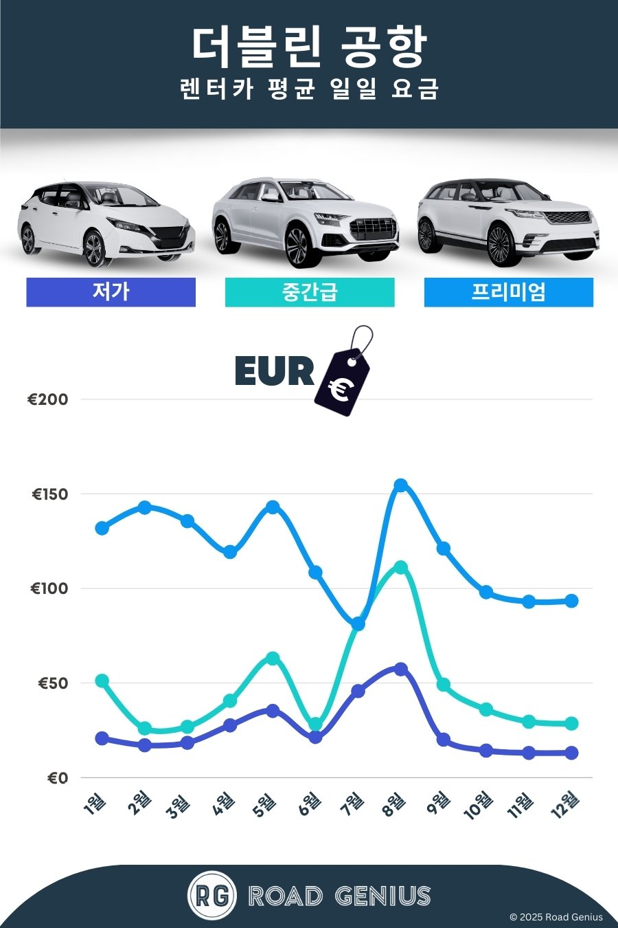 평균적으로 더블린 공항에서 렌터카 요금은 하루에 약 €64이며, 최저가는 하루에 €13부터 이용할 수 있습니다.