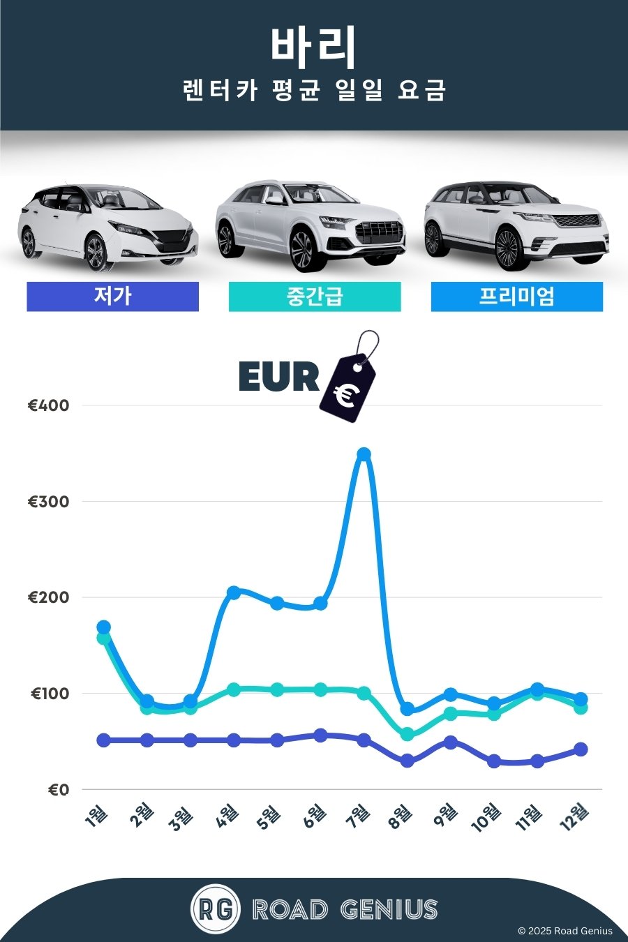 평균적으로 바리에서 렌터카 요금은 하루에 약 €96이며, 최저가는 하루에 €29부터 이용할 수 있습니다.