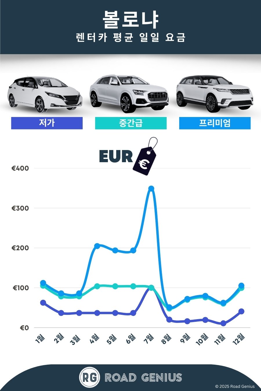 평균적으로 볼로냐에서 렌터카 요금은 하루에 약 €85이며, 최저가는 하루에 €11부터 이용할 수 있습니다.