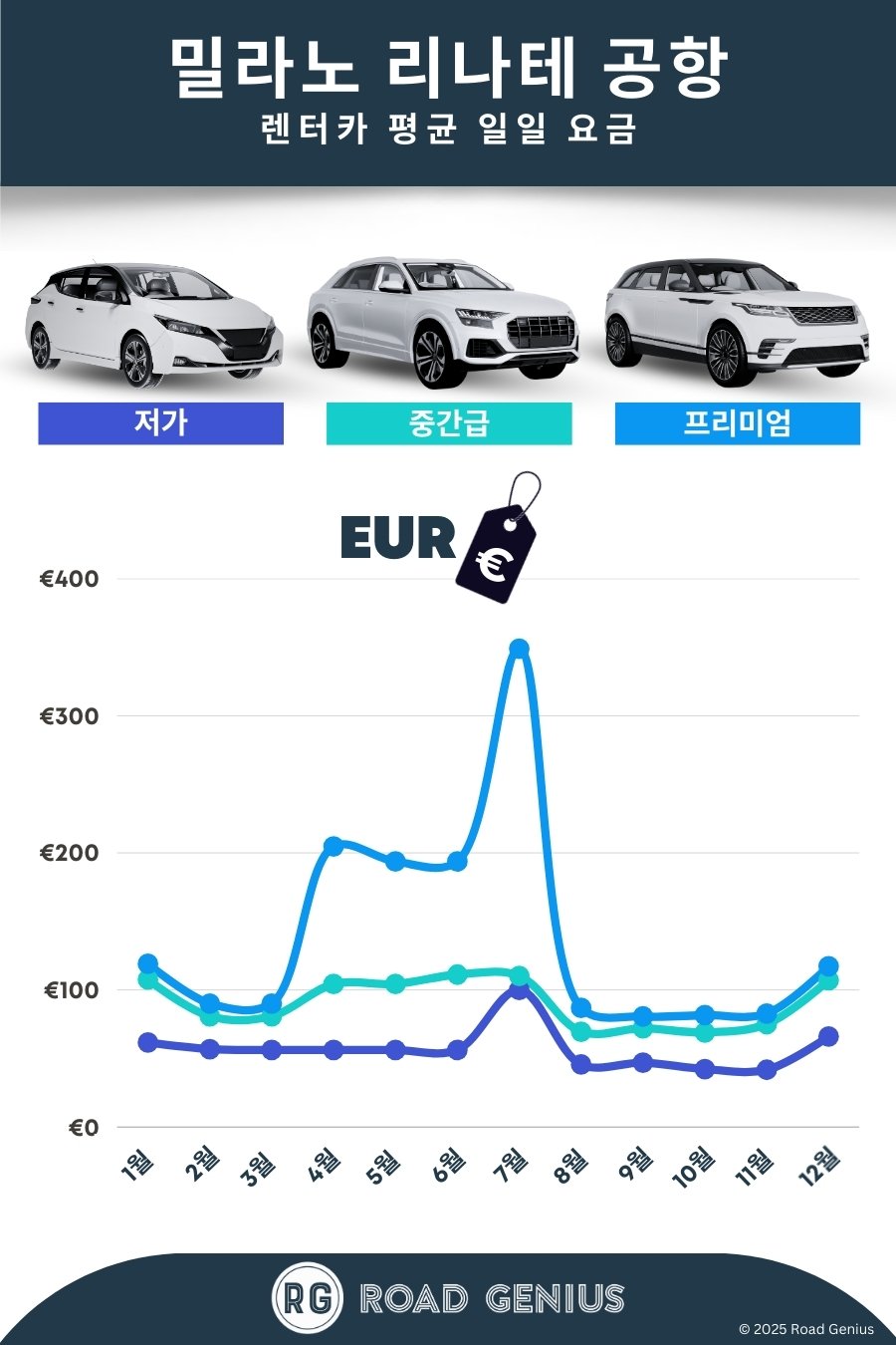 평균적으로 밀라노 리나테 공항에서 렌터카 요금은 하루에 약 €96이며, 최저가는 하루에 €42부터 이용할 수 있습니다.