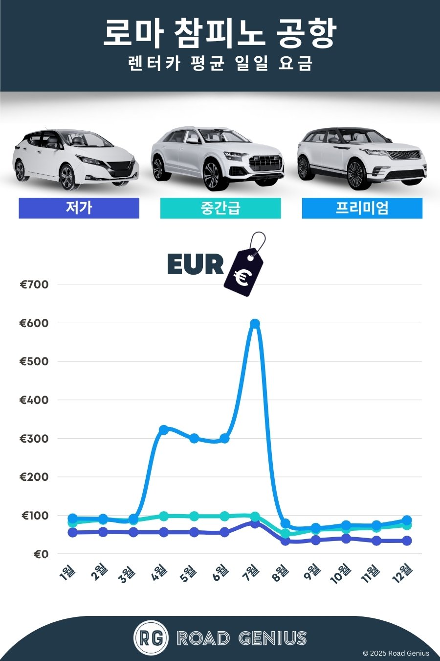 평균적으로 로마참피노공항에서 렌터카 요금은 하루에 약 €104이며, 최저가는 하루에 €34부터 이용할 수 있습니다.