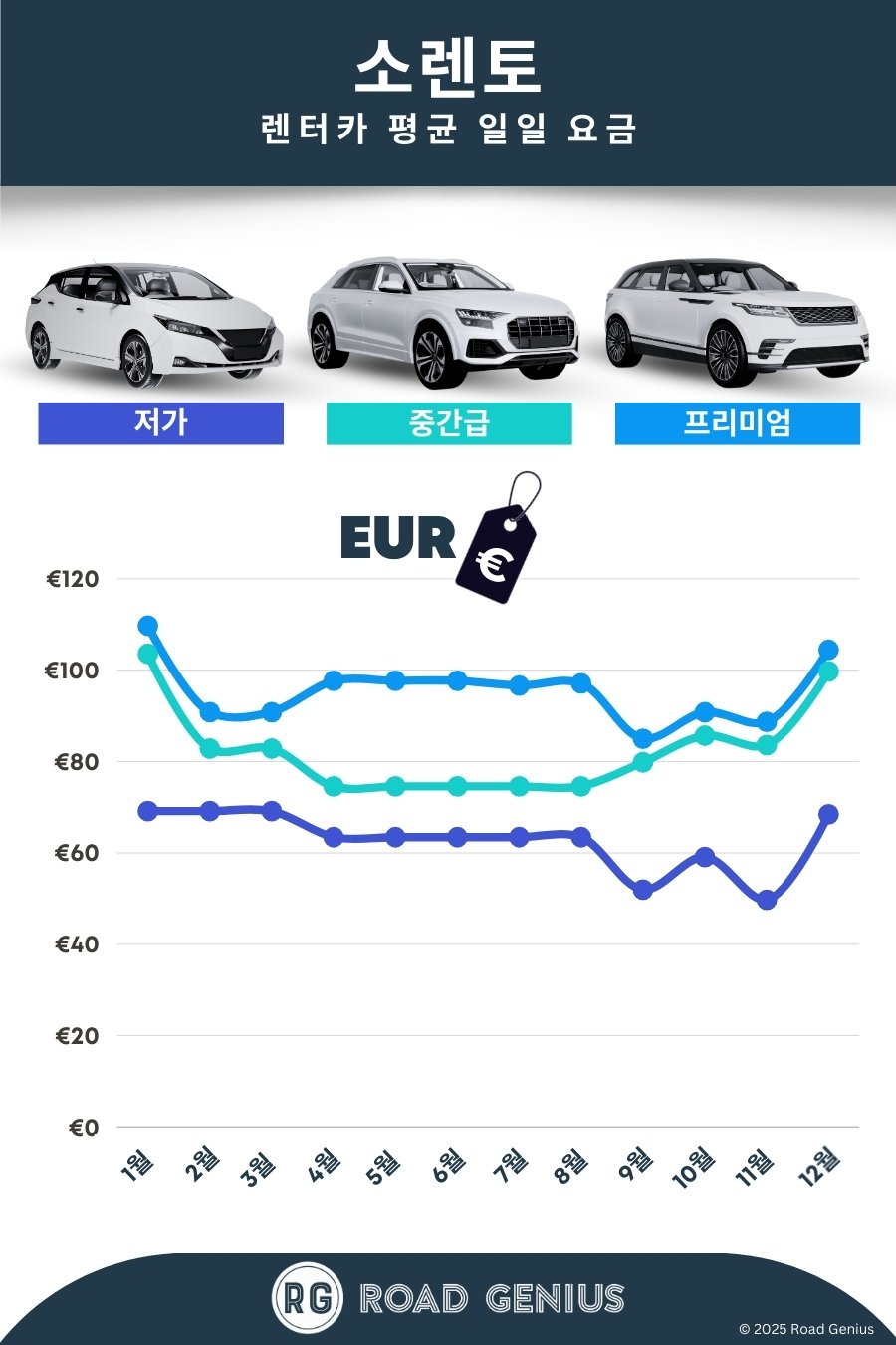 평균적으로 소렌토에서 렌터카 요금은 하루에 약 €80이며, 최저가는 하루에 €50부터 이용할 수 있습니다.