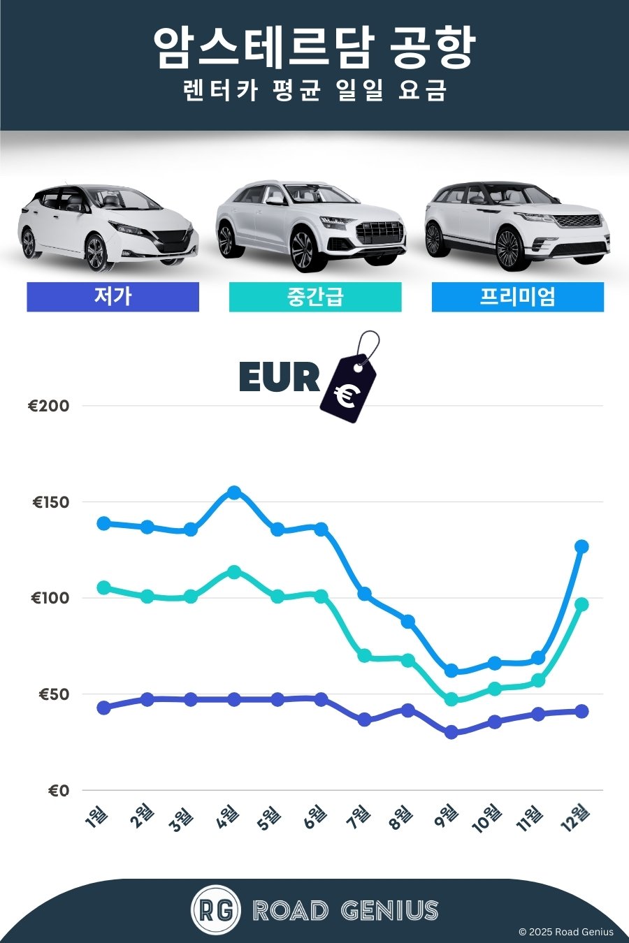 평균적으로 암스테르담스키폴공항에서 렌터카 요금은 하루에 약 €80이며, 최저가는 하루에 €30부터 이용할 수 있습니다.