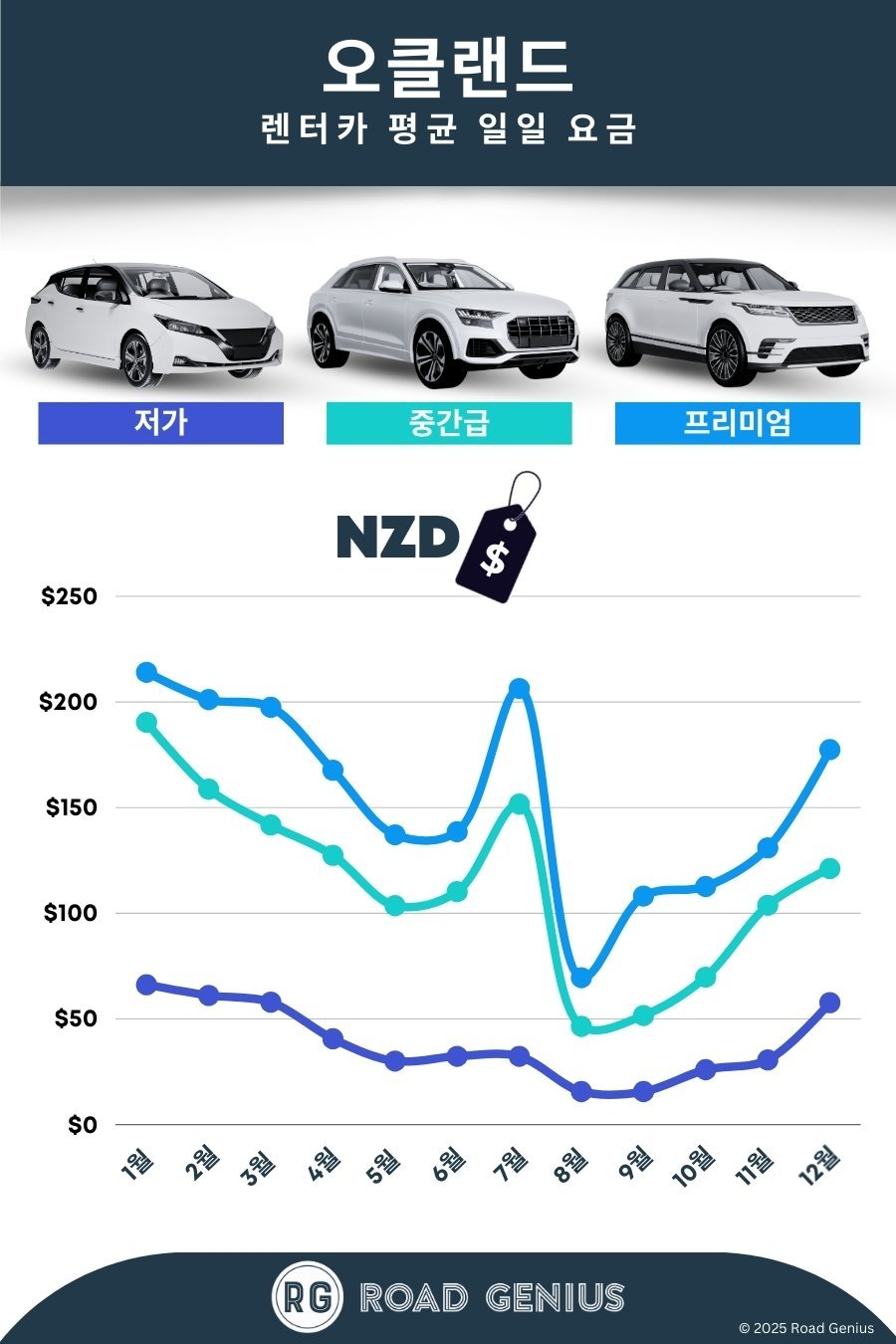 평균적으로 오클랜드에서 렌터카 요금은 하루에 약 NZ$103이며, 최저가는 하루에 NZ$16부터 이용할 수 있습니다.