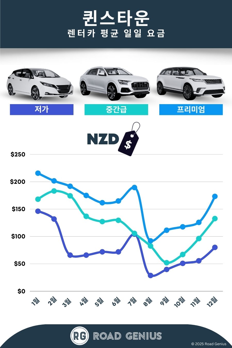 평균적으로 퀸스타운에서 렌터카 요금은 하루에 약 NZ$119이며, 최저가는 하루에 NZ$29부터 이용할 수 있습니다.