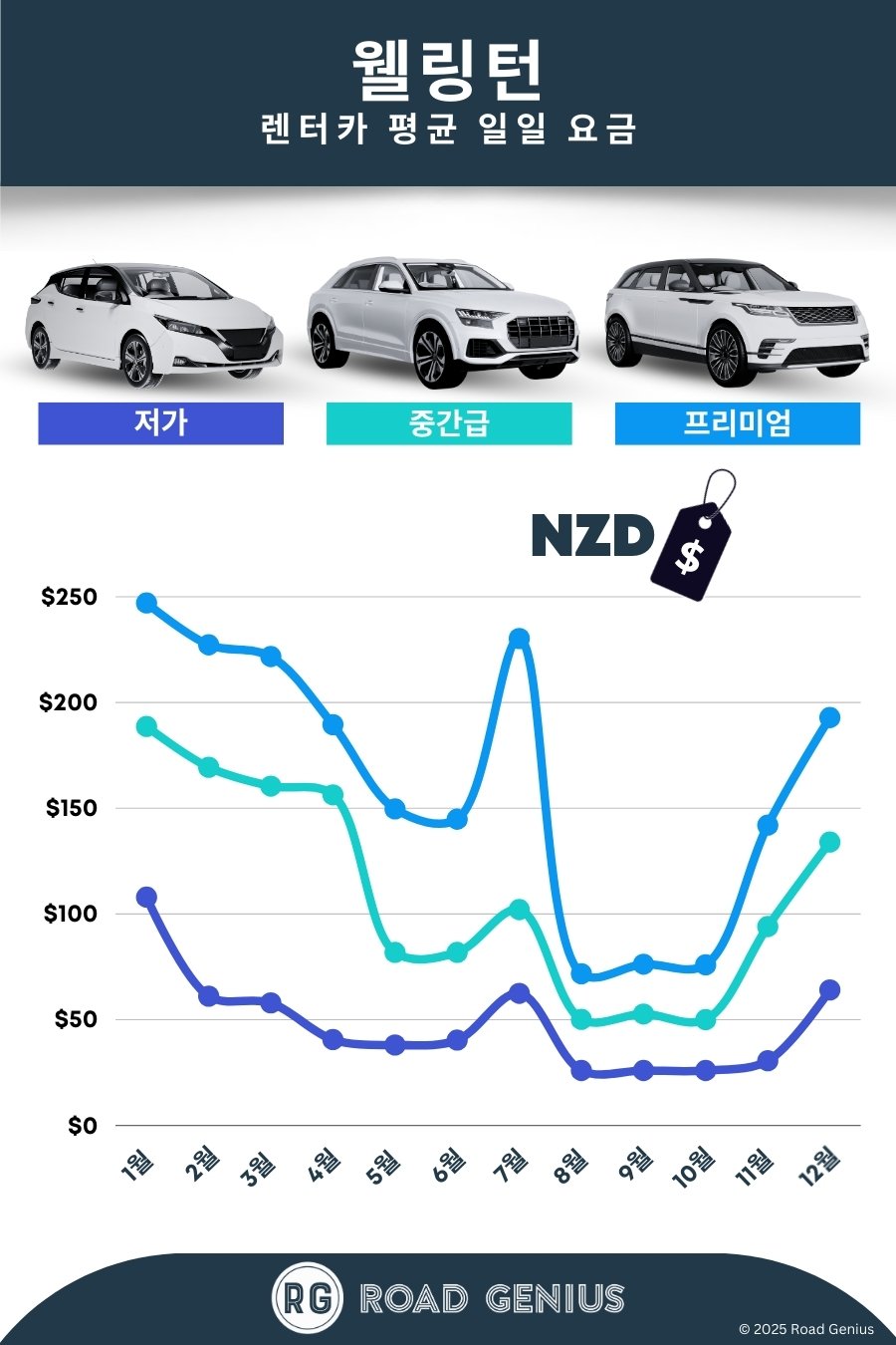 평균적으로 웰링턴에서 렌터카 요금은 하루에 약 NZ$108이며, 최저가는 하루에 NZ$26부터 이용할 수 있습니다.
