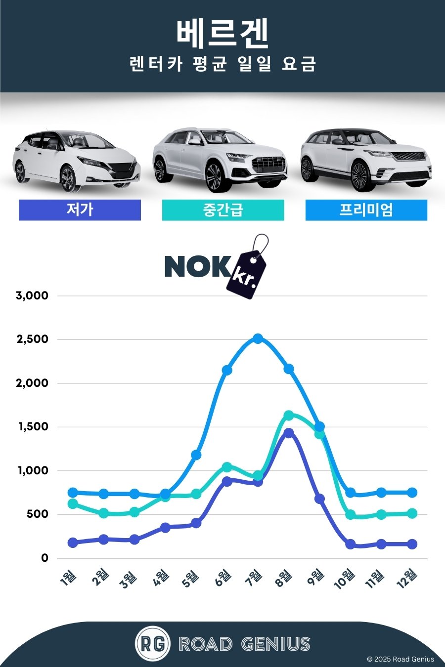 평균적으로 베르겐에서 렌터카 요금은 하루에 약 kr 835이며, 최저가는 하루에 kr 160부터 이용할 수 있습니다.