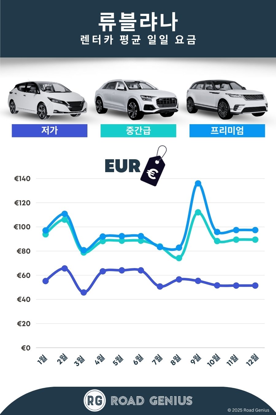 평균적으로 류블라냐에서 렌터카 요금은 하루에 약 €81이며, 최저가는 하루에 €46부터 이용할 수 있습니다.