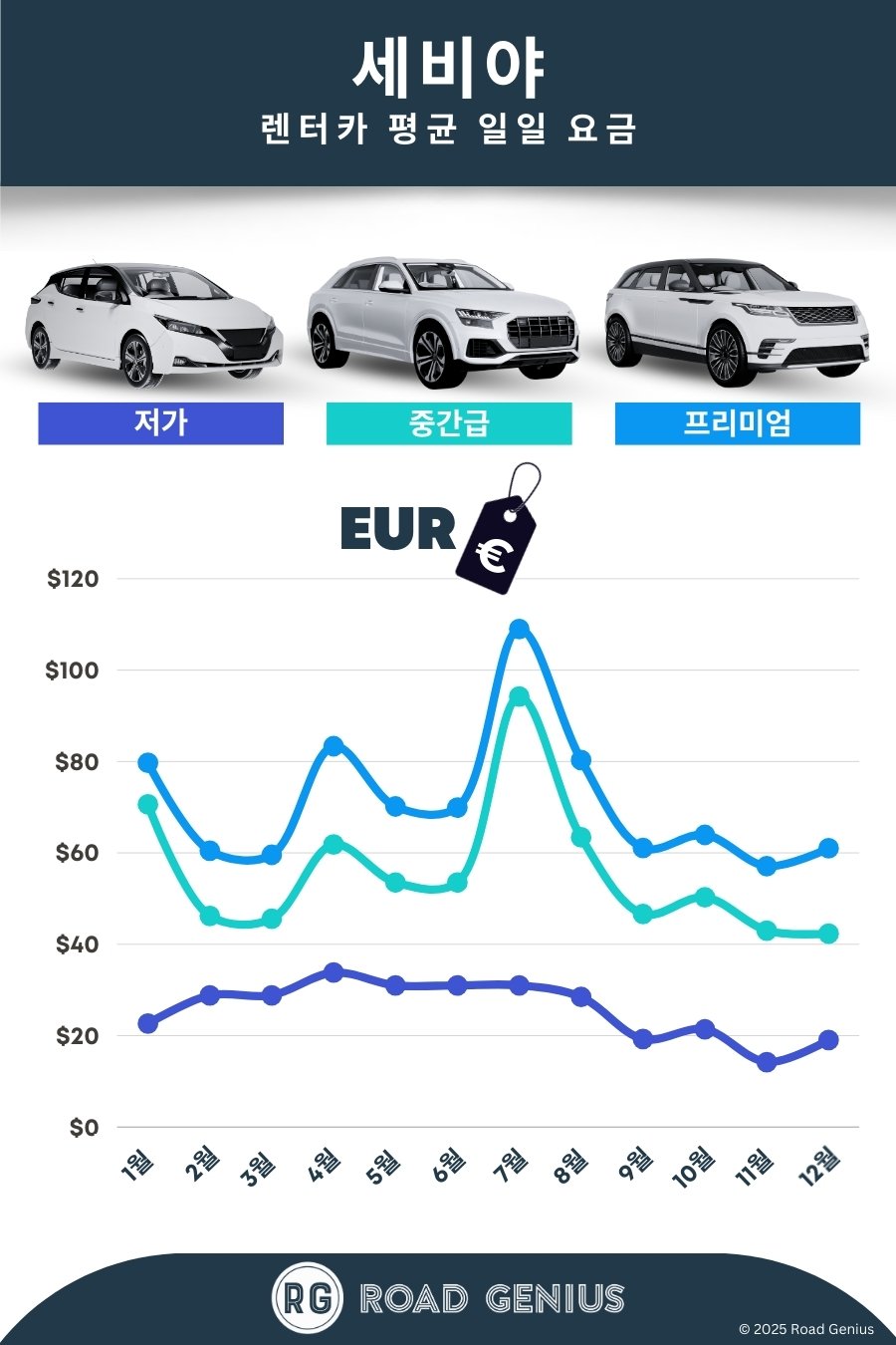 평균적으로 세비야에서 렌터카 요금은 하루에 약 €51이며, 최저가는 하루에 €14부터 이용할 수 있습니다.
