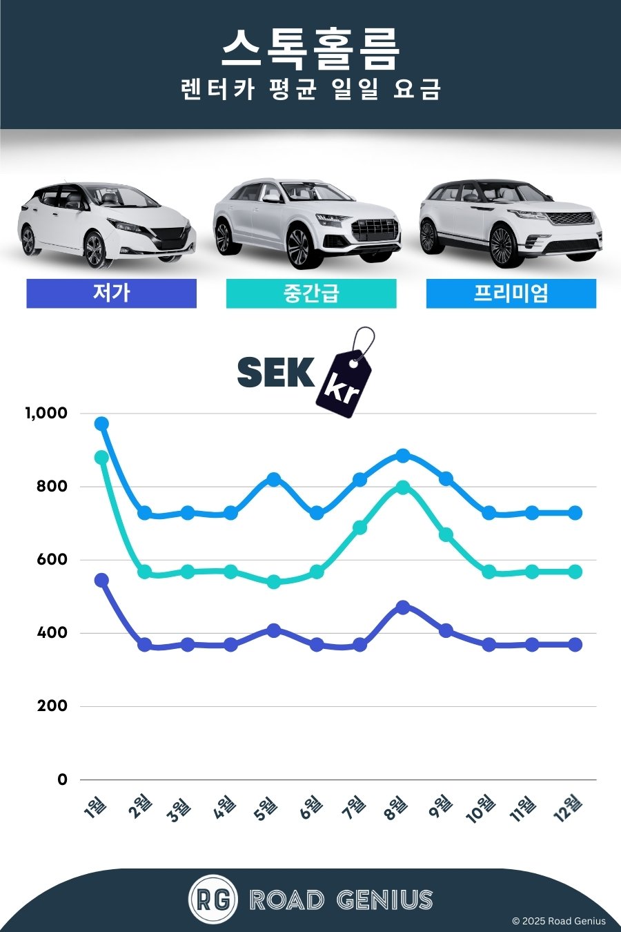 평균적으로 스톡홀름에서 렌터카 요금은 하루에 약 kr 604이며, 최저가는 하루에 kr 369부터 이용할 수 있습니다.