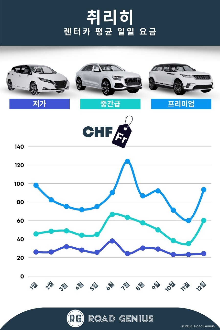 로드지니어스에서 취리히 주요 렌터카 업체 요금을 한눈에 비교해 보세요. 소형차부터 고급 SUV, 밴까지 다양한 차종을 합리적인 가격에 예약할 수 있습니다. 취리히 공항(ZRH), 취리히 중앙역(Hauptbahnhof) 또는 시내 지점에서 차량을 인수하면 A1, A3 고속도로를 통해 루체른, 인터라켄 등 알프스 명소로 편리하게 이동할 수 있습니다. 여름 휴가철과 겨울 스키 시즌에는 사전 예약이 필수입니다. 스위스 렌터카에는 대부분 고속도로 통행증(비넷)이 포함되어 있으며, 동계에는 윈터 타이어가 기본 장착됩니다.