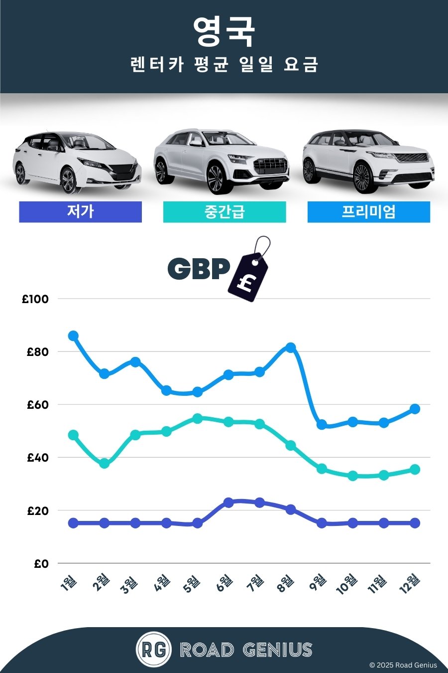 평균적으로 영국에서 렌터카 요금은 하루에 약 €43이며, 최저가는 하루에 €15부터 이용할 수 있습니다.