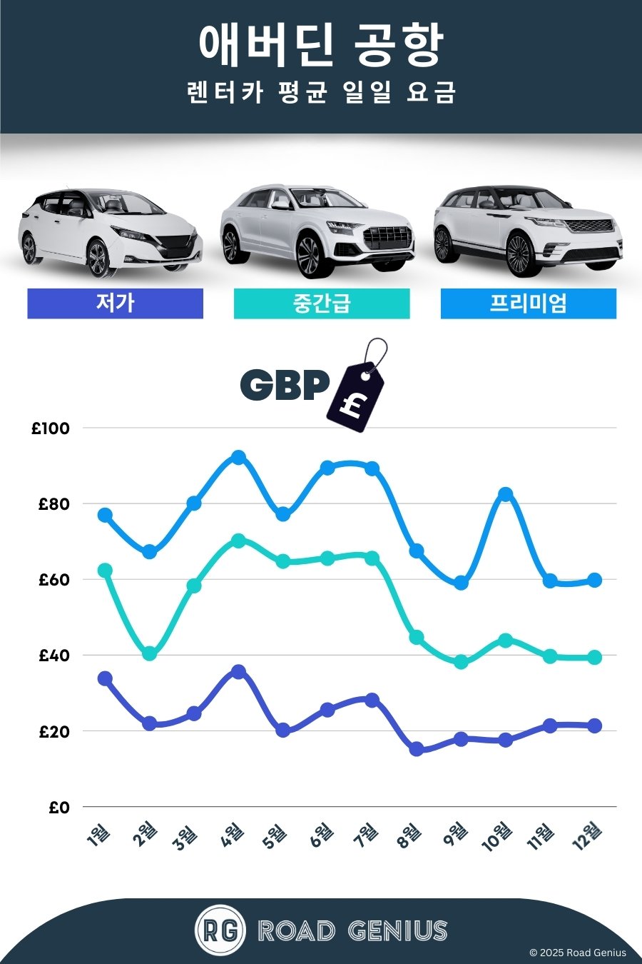 평균적으로 애버딘공항에서 렌터카 요금은 하루에 약 €50이며, 최저가는 하루에 €15부터 이용할 수 있습니다.