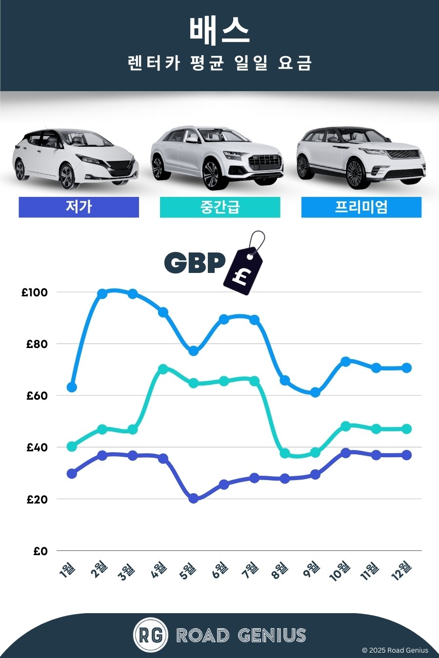 인수 장소 비교: 바스 시내에서 인수하면 공항 할증료를 피할 수 있지만, 공항 지점은 보유 차량이 더 많고 영업시간이 깁니다. 최종 결정을 내리기 전에 바스 시내, 브리스톨 공항, 히드로 공항의 총 렌트 비용을 꼼꼼히 비교하는 것이 좋습니다.
