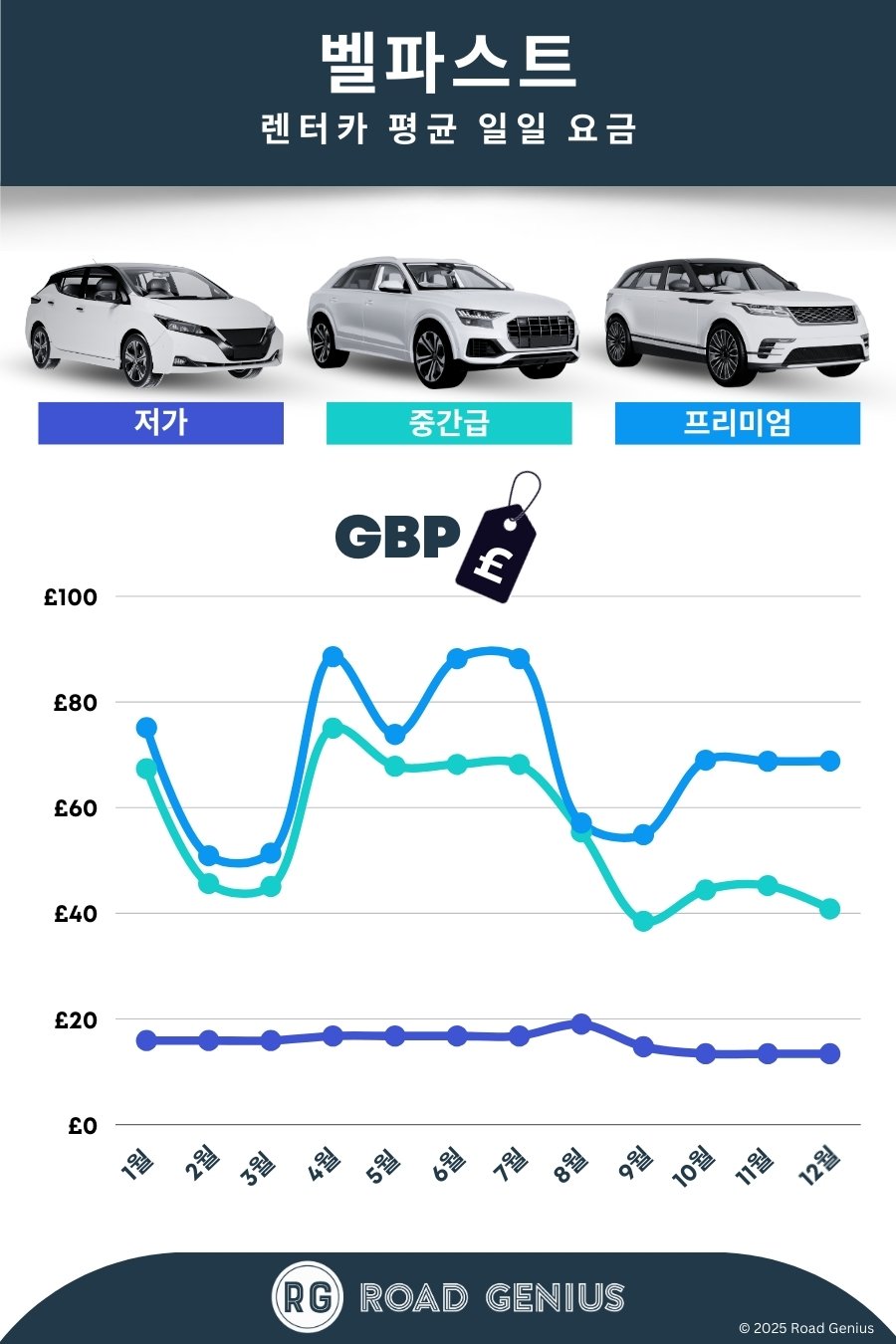 픽업 장소 비교하기: BFS 공항, BHD 공항, 벨파스트 시내 지점의 요금을 모두 비교해 보세요. 시내 지점은 공항 할증료가 없지만, 공항에서 시내까지 이동하는 비용과 시간을 고려해야 합니다.