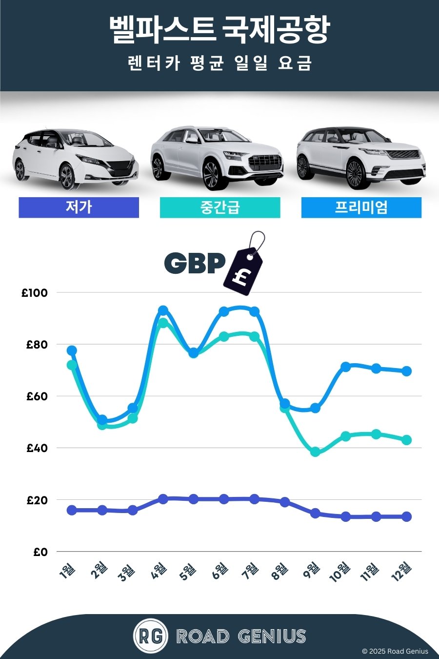 차량 등급, 크기, 픽업 요일을 꼼꼼히 비교하세요. 벨파스트 국제공항은 월요일이 가장 붐비는 경향이 있으니, 일요일이나 다른 요일 요금도 함께 확인해 보세요.
