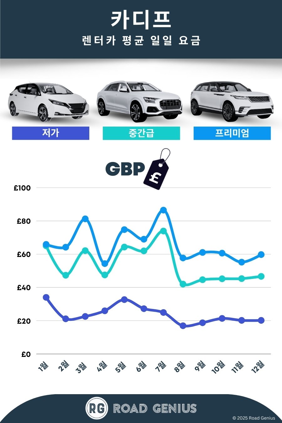 주요 행사 기간 피해서 예약: 식스 네이션스 럭비 경기나 프린시팰리티 스타디움 콘서트 기간에는 요금이 급등합니다. 해당 시기에는 최대한 일찍 예약하거나 픽업 날짜를 조정하여 요금 인상을 피하세요.