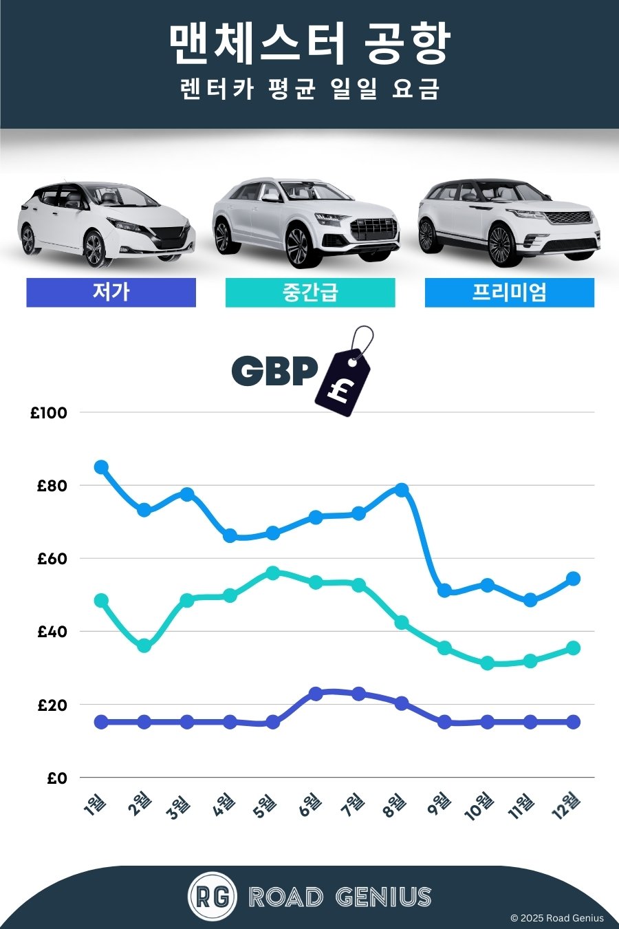 평균적으로 맨체스터공항에서 렌터카 요금은 하루에 약 €42이며, 최저가는 하루에 €15부터 이용할 수 있습니다.