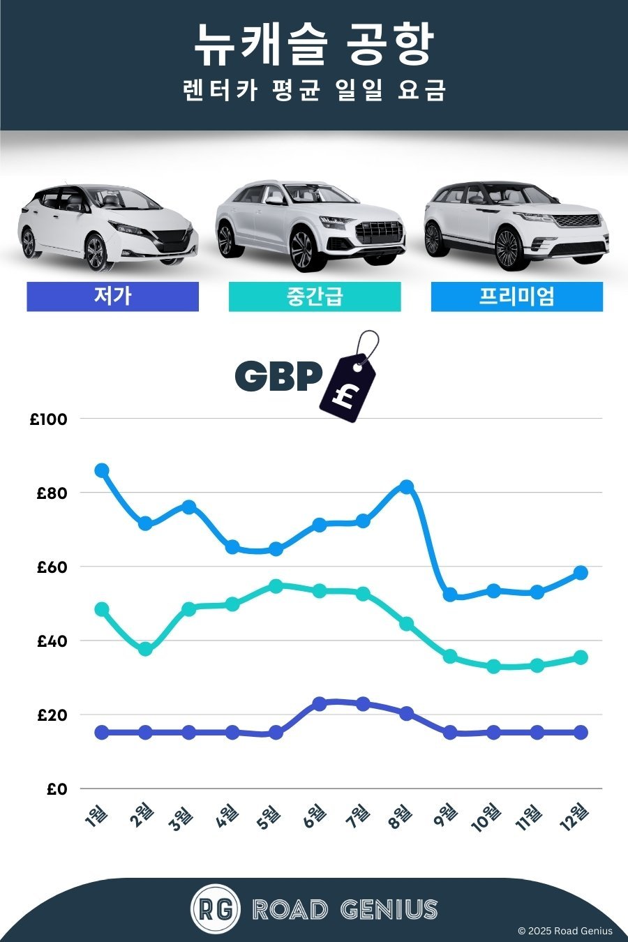 평균적으로 뉴캐슬공항에서 렌터카 요금은 하루에 약 €55이며, 최저가는 하루에 €12부터 이용할 수 있습니다.