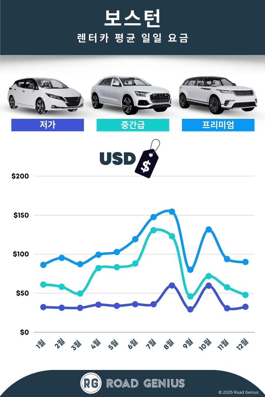 로드지니어스(Roadgenius)를 통해 보스턴 렌터카를 쉽고 간편하게 예약하실 수 있습니다. 저희는 미국 전역의 수십 개 렌터카 업체의 요금을 예약 수수료 없이 한눈에 비교해 드립니다. 여행 일정에 맞춰 로건 국제공항, 시내 또는 근교에서 차량을 선택할 수 있으며, 뉴잉글랜드 지역 로드 트립에 유용한 편도 대여 옵션도 편리하게 비교할 수 있습니다.