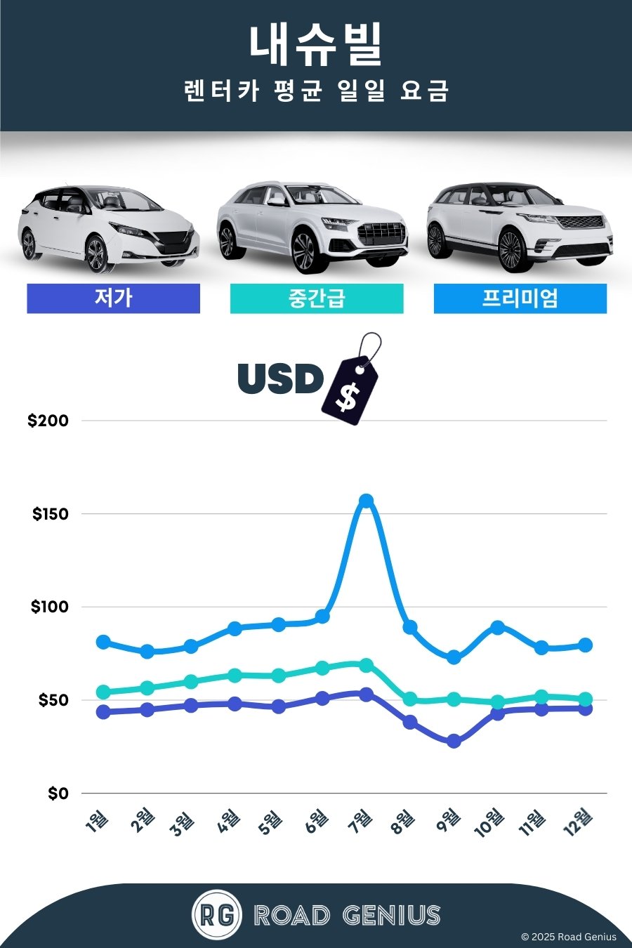 평균적으로 내슈빌에서 렌터카 요금은 하루에 약 US$64이며, 최저가는 하루에 US$28부터 이용할 수 있습니다.