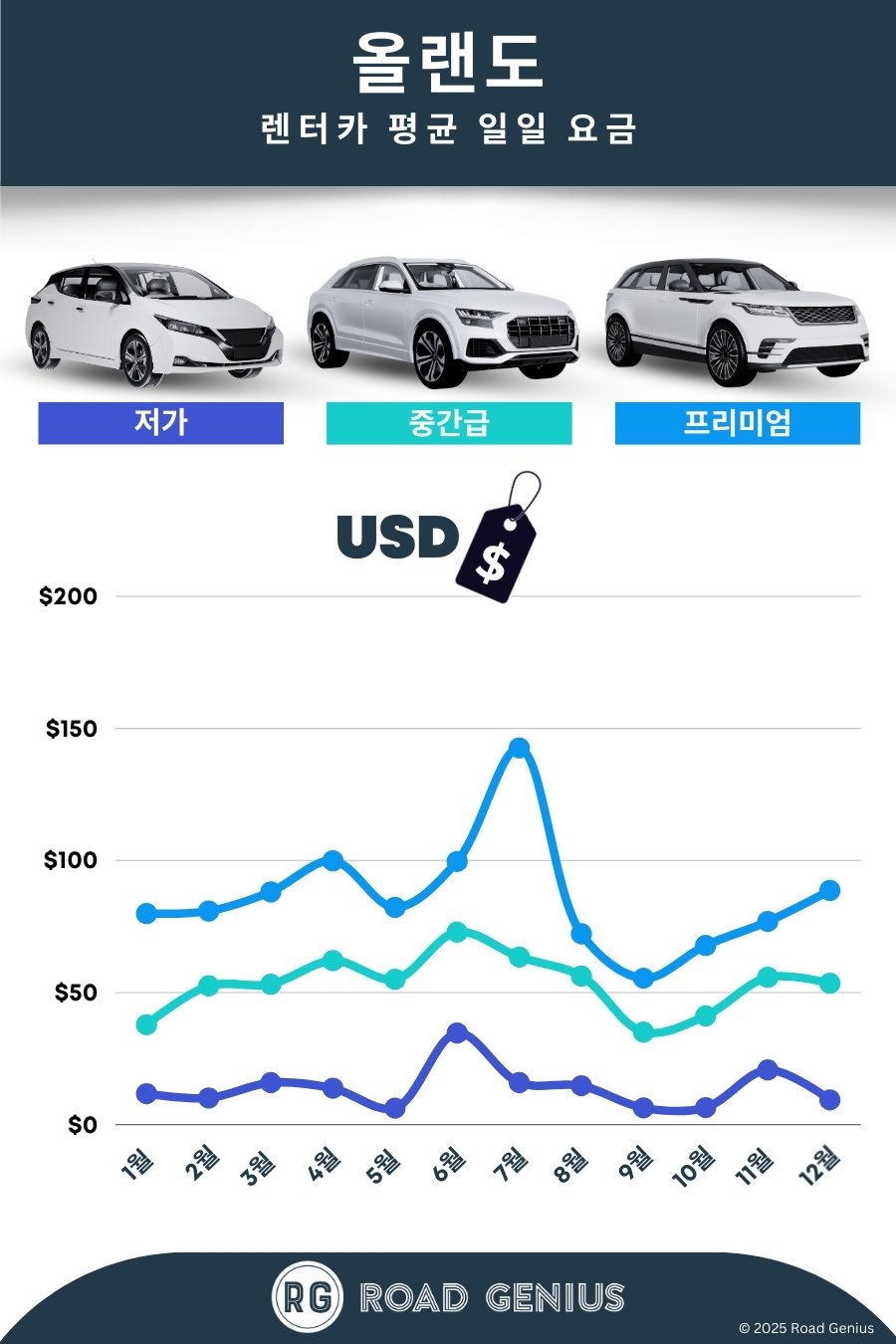 평균적으로 올랜도에서 렌터카 요금은 하루에 약 US$51이며, 최저가는 하루에 US$6부터 이용할 수 있습니다.