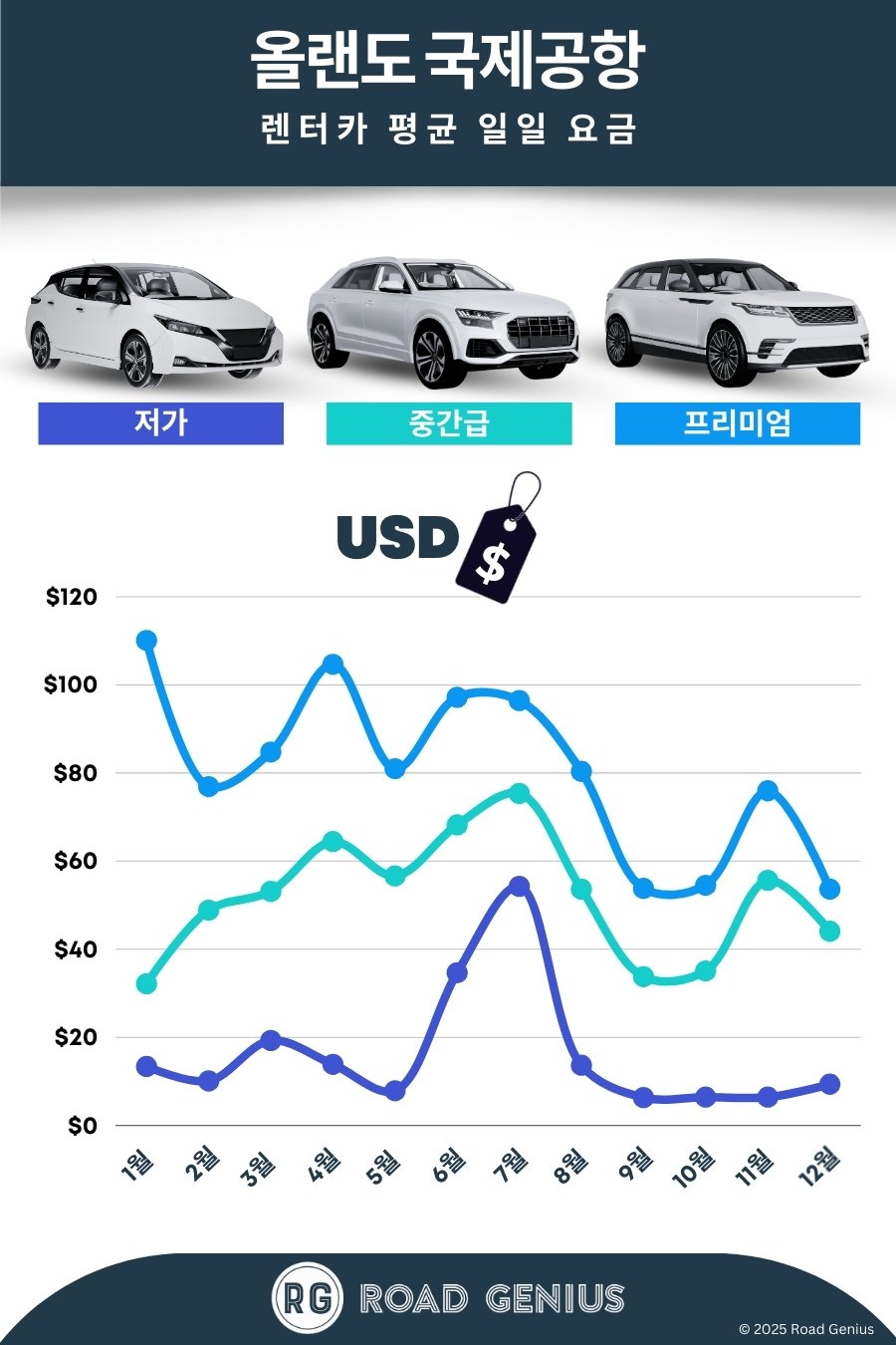 평균적으로 올랜도국제공항에서 렌터카 요금은 하루에 약 US$50이며, 최저가는 하루에 US$6부터 이용할 수 있습니다.