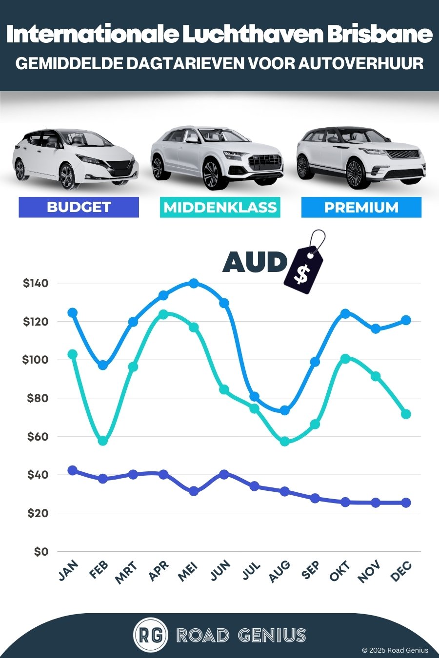 Gemiddeld kost een huurauto op Brisbane Airport (BNE) ongeveer AUD 103 per dag, waarbij de goedkoopste opties beschikbaar zijn vanaf AUD 25 per dag.