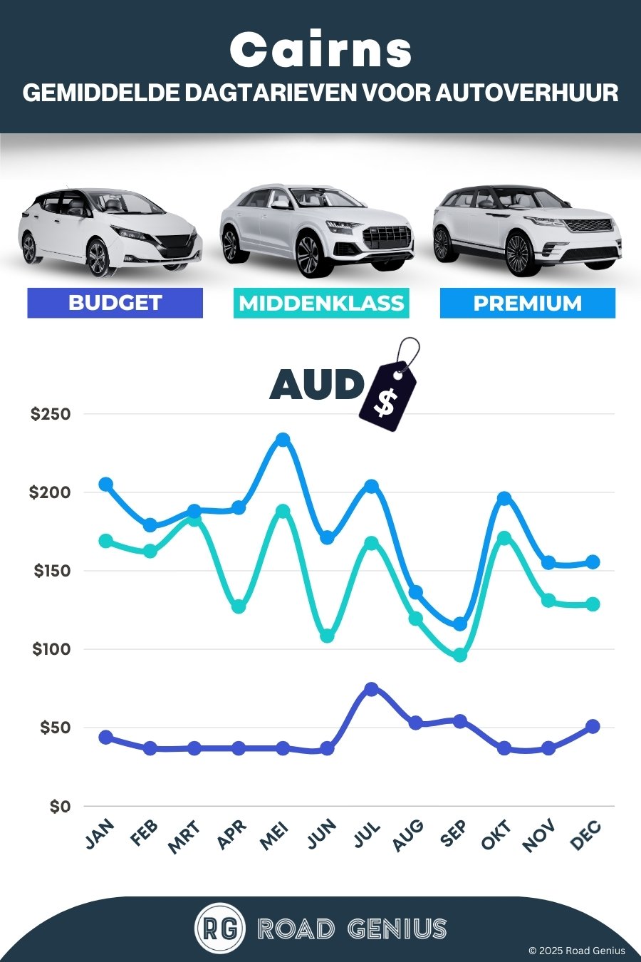 Gemiddeld kost een huurauto in Cairns ongeveer AUD 157 per dag, terwijl de goedkoopste tarieven beginnen bij AUD 37 per dag.
