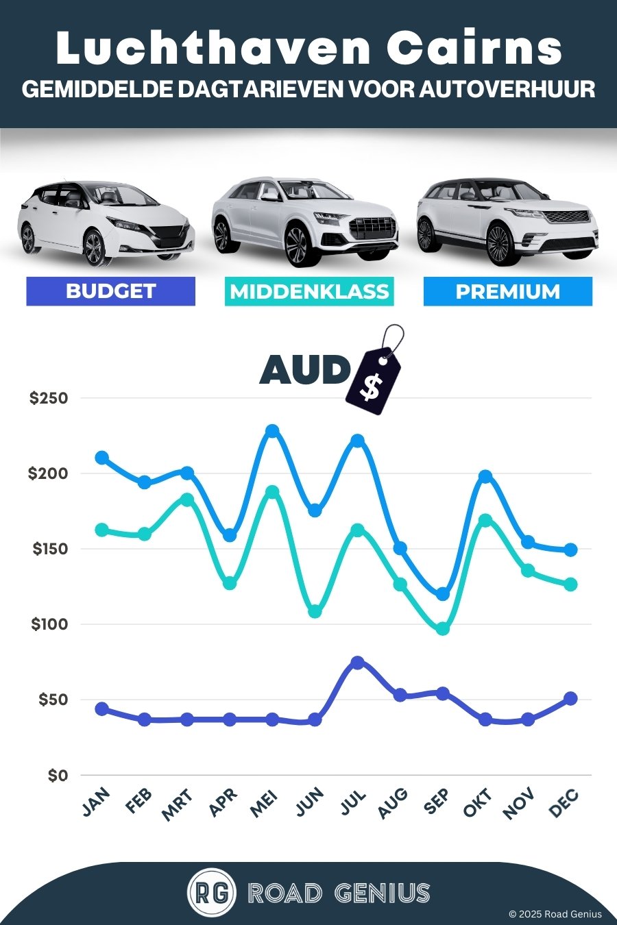 Gemiddeld kost autoverhuur op Cairns Airport (CNS) ongeveer AUD 159 per dag, met de goedkoopste huurauto's vanaf AUD 37 per dag.