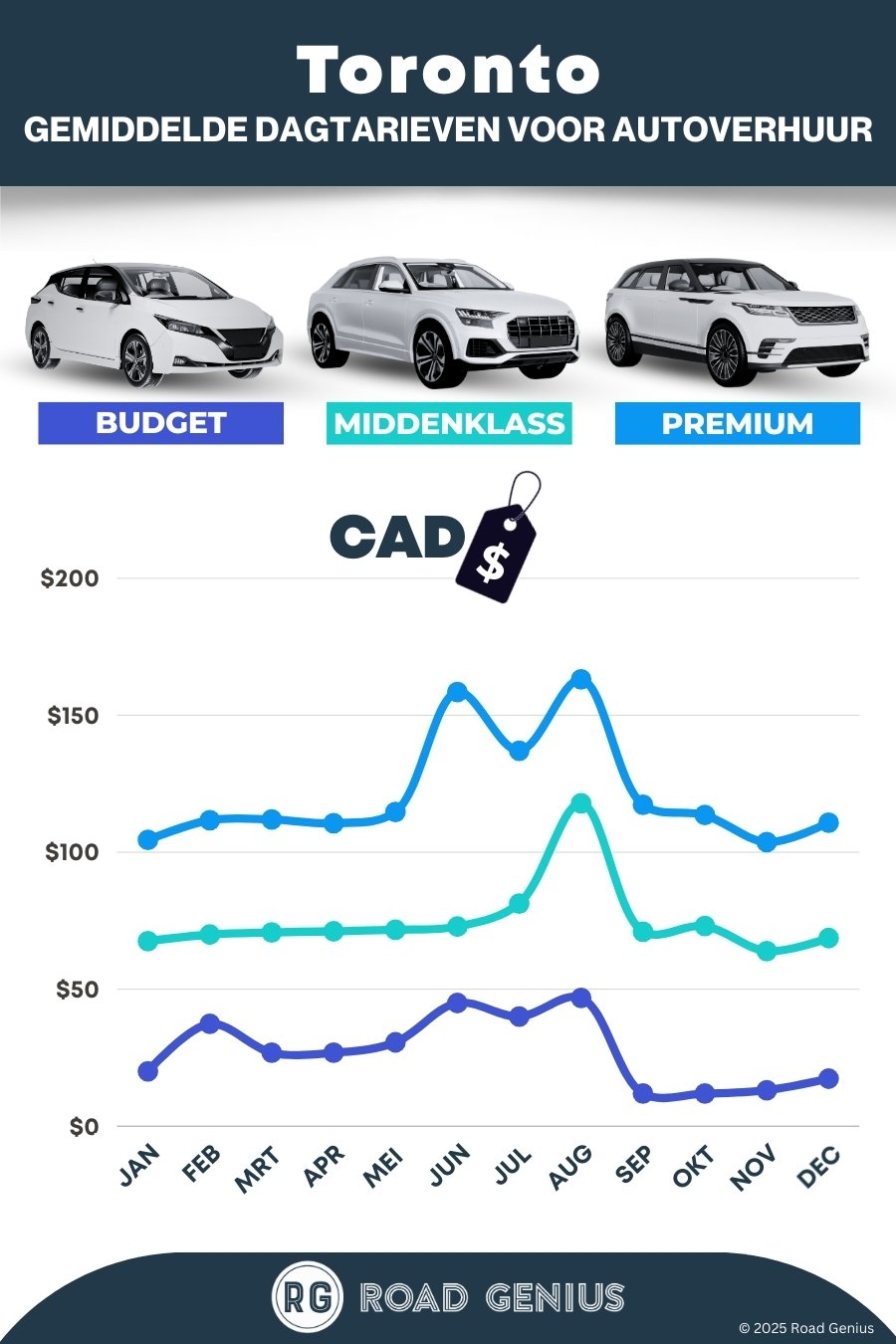 Gemiddeld kost autohuur in Toronto ongeveer CA$ 75 per dag, met de goedkoopste huurauto’s vanaf CA$ 12 per dag.