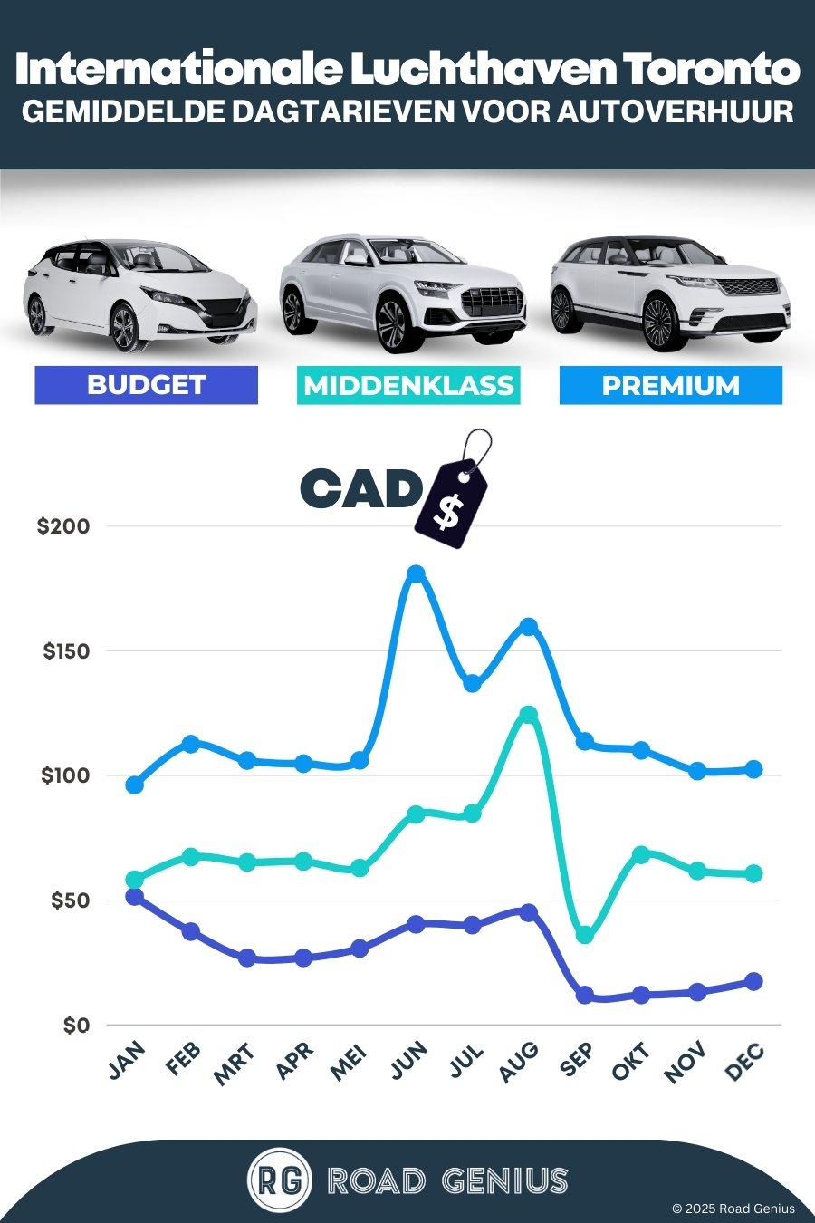 Gemiddeld kost autohuur op Luchthaven Toronto Pearson ongeveer CA$ 73 per dag, met de goedkoopste huurauto’s vanaf CA$ 12 per dag.